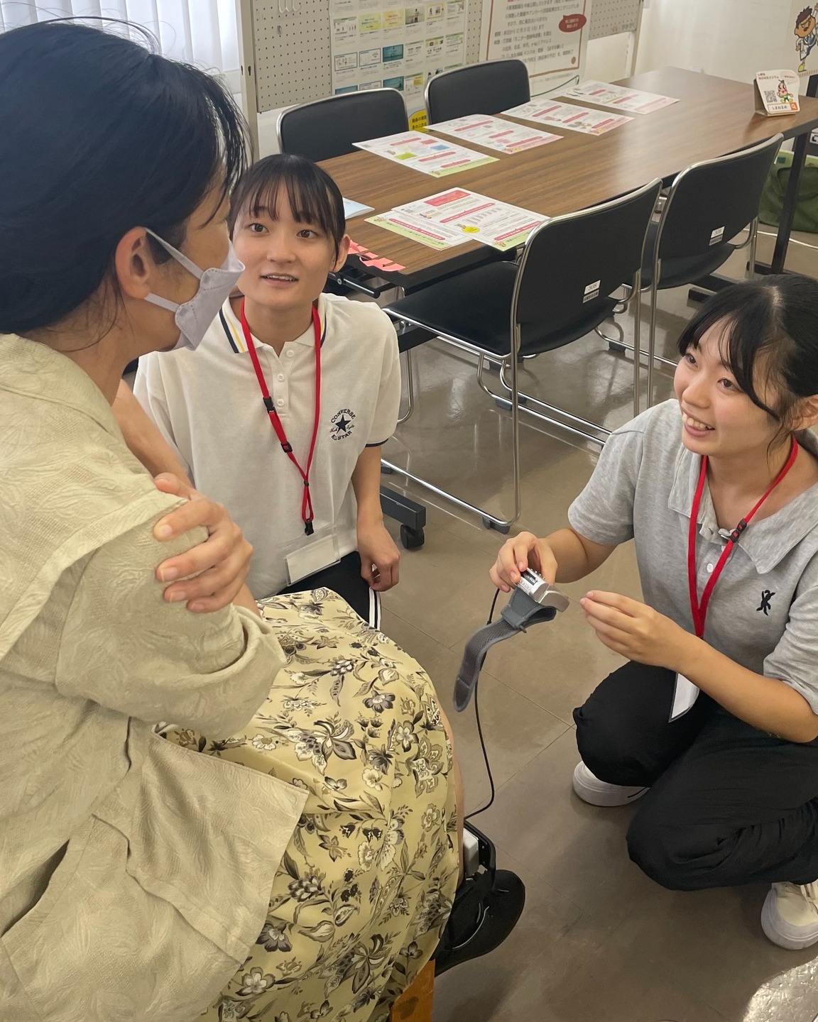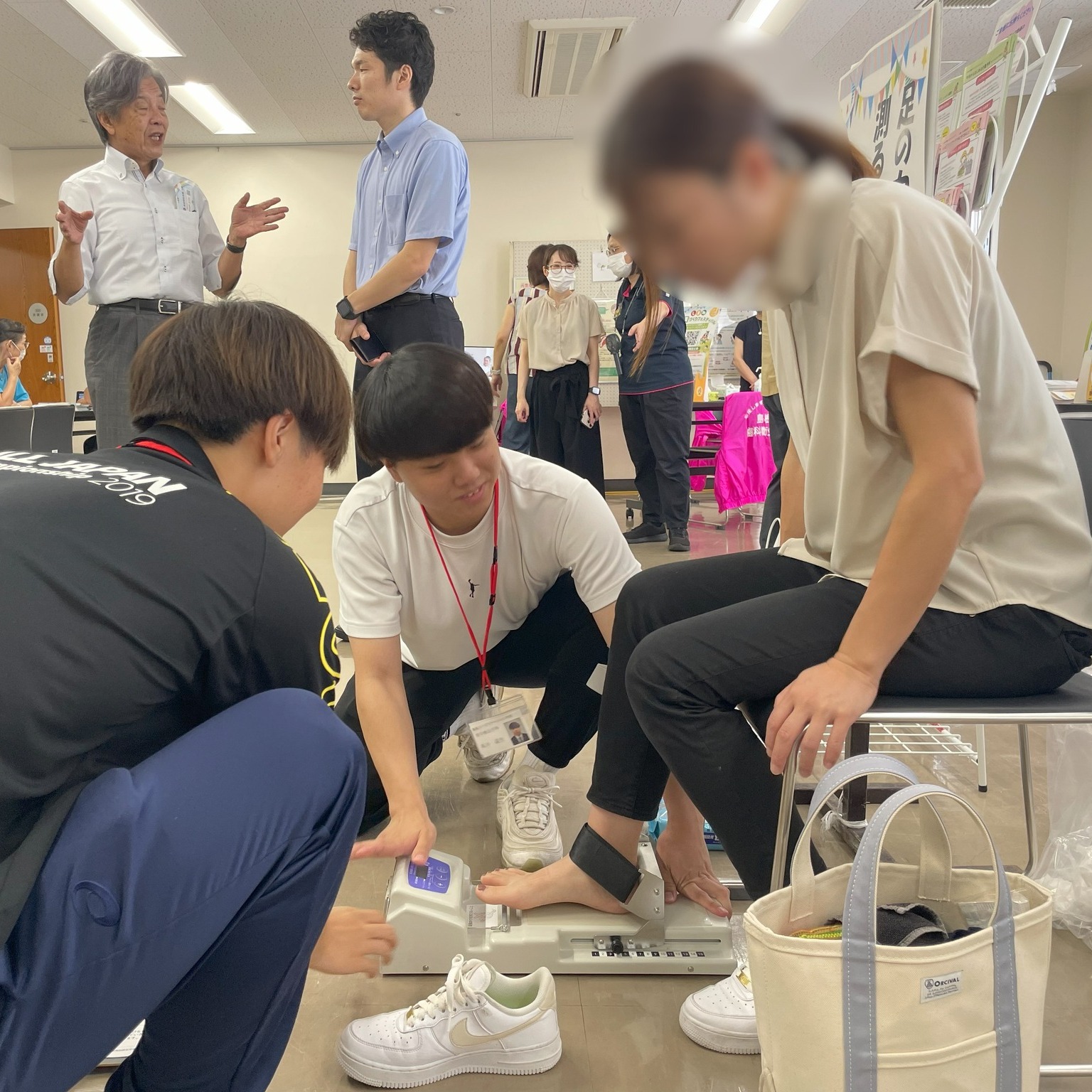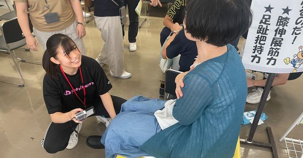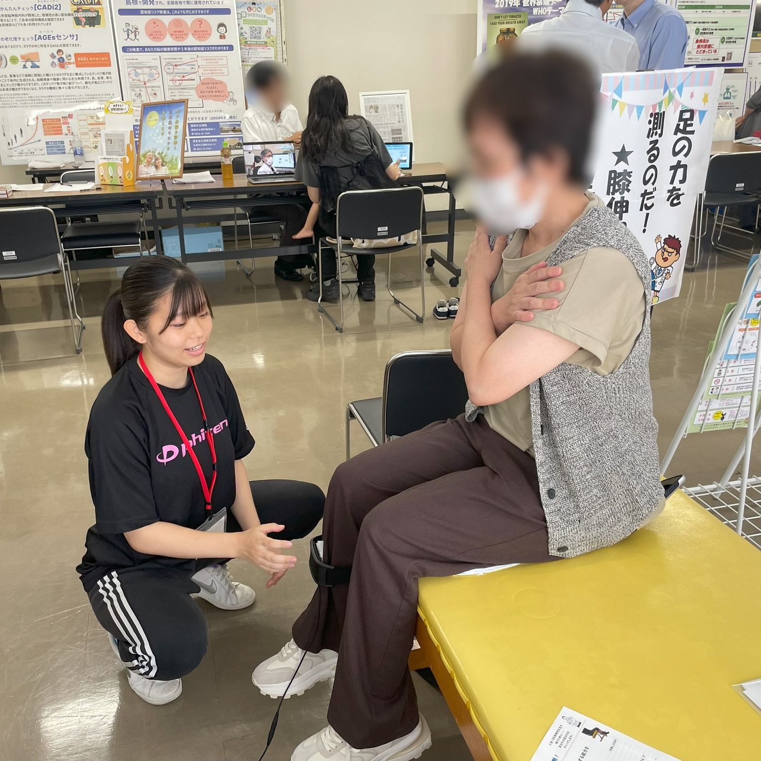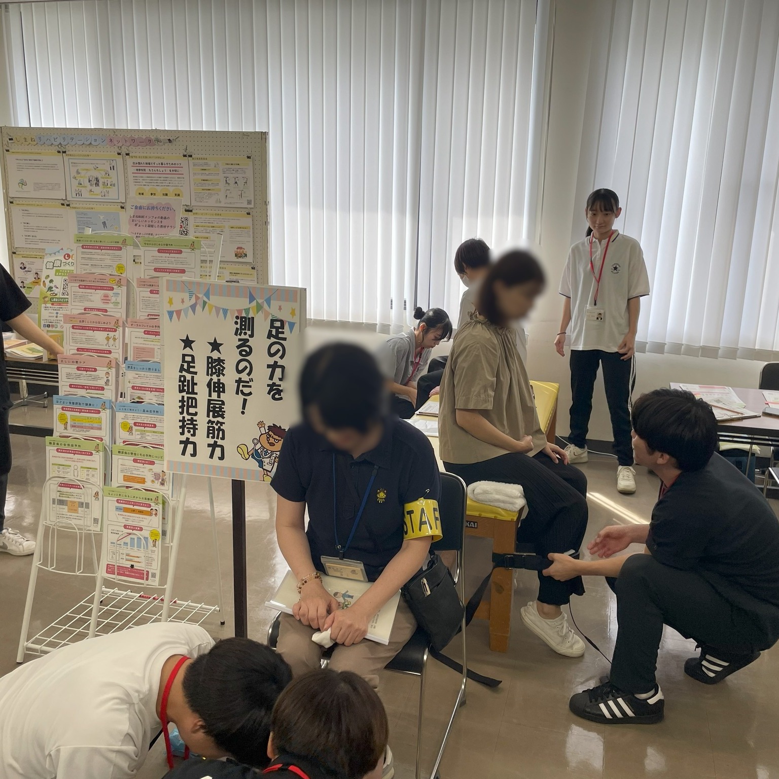 シマリハの学生は、参加者の皆様の太ももの筋力や足の指の筋力をチェックしました!1日経過して、なんと延べ100名近くの方々の測定を行いました!学生たちは経験を重ねるごとに測定や声掛けが上手になっていきました。参加者の方々も「元気がでたわ~」、「応援してもらってうれしいわ~」とおっしゃっておられました!