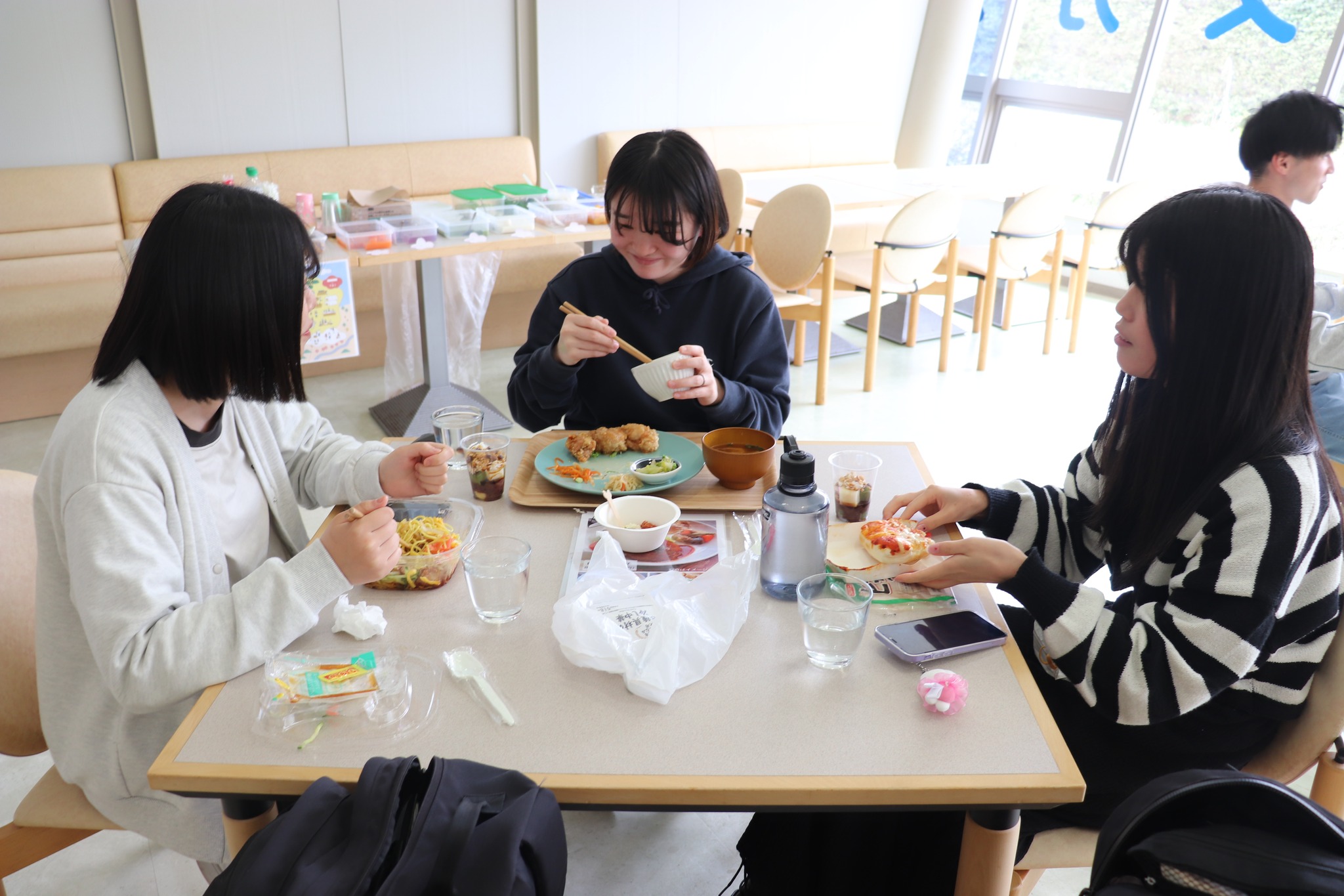 この日は、「owl coffee」さんのハンドドリップコーヒーや「あそびばきっちん」さんのおいしい健康惣菜の無料提供もあって、学生たちがわいわいとランチタイムを楽しんでいました。