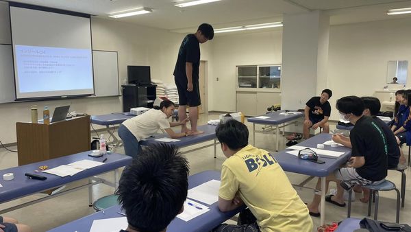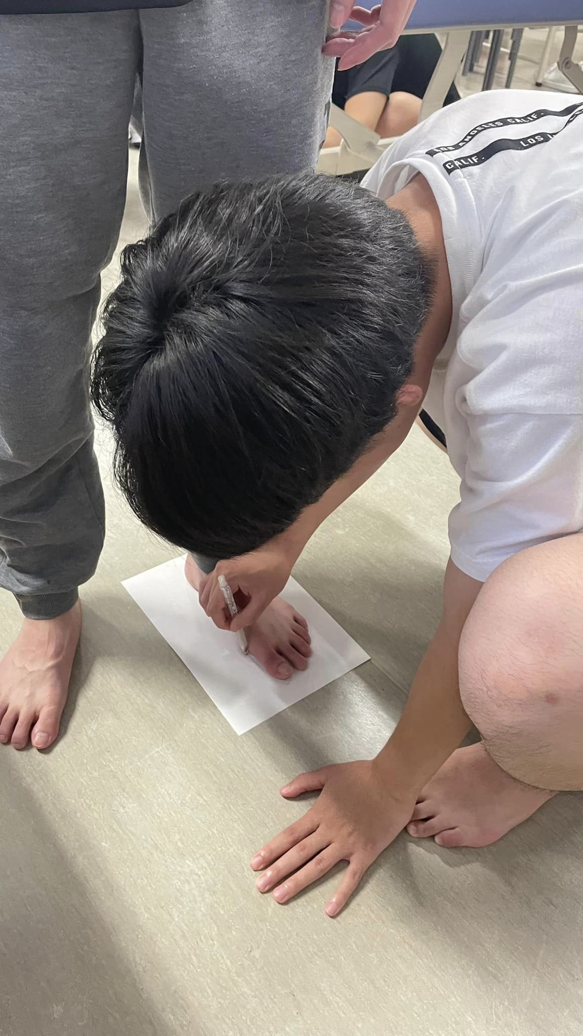 学生たちは、先生のわかりやすい講義にもとづいて、友達や自らの足の状態、立ち姿勢などをチェック!