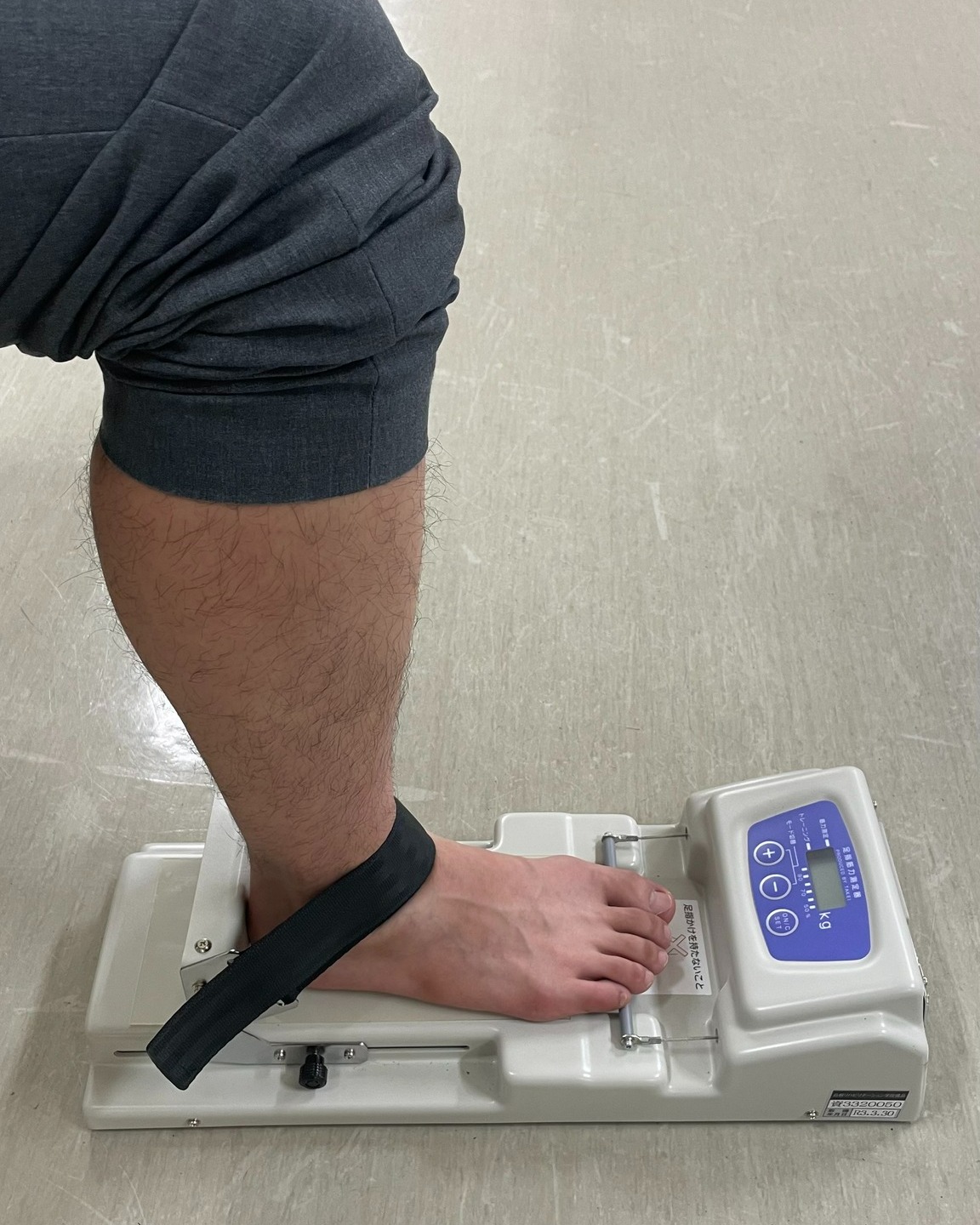 本学の山﨑、学生は体力チェックを行います!!太ももの筋力測定や足の指の筋力をチェックします!!