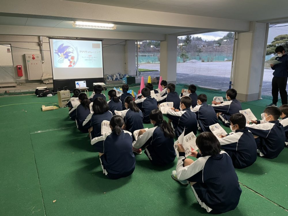 今回授業を受けていただいたのは横田中学校ホッケー部の皆さん。本学の学生たちが講義やトレーニング指導を行い、中学生には実際に体を動かしてトレーニングを実践してもらいました。画面越しではありましたが、熱心に話を聞いていただき、これからの部活動に生かせる実践的な運動メニューを体験してもらうことができました。