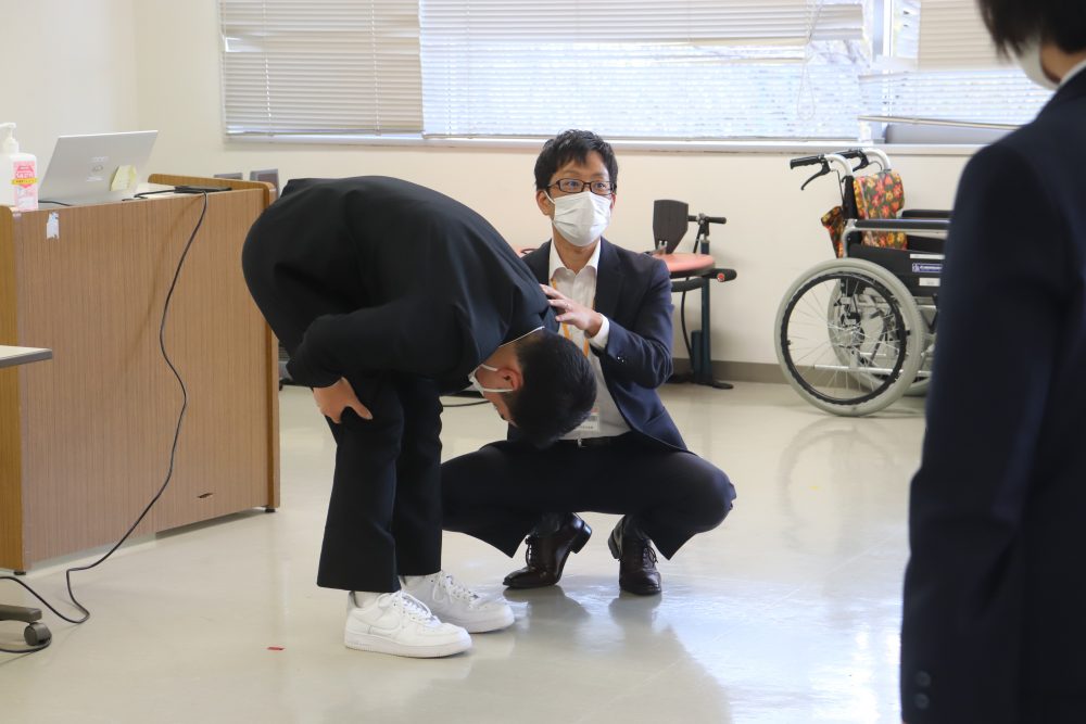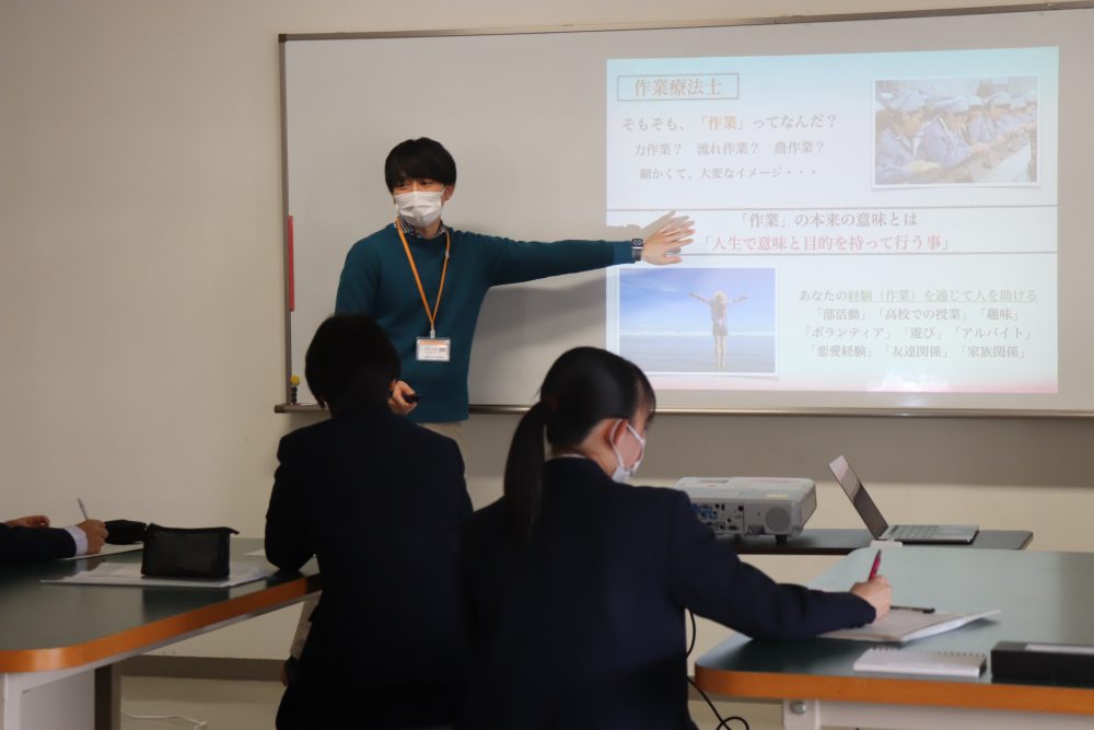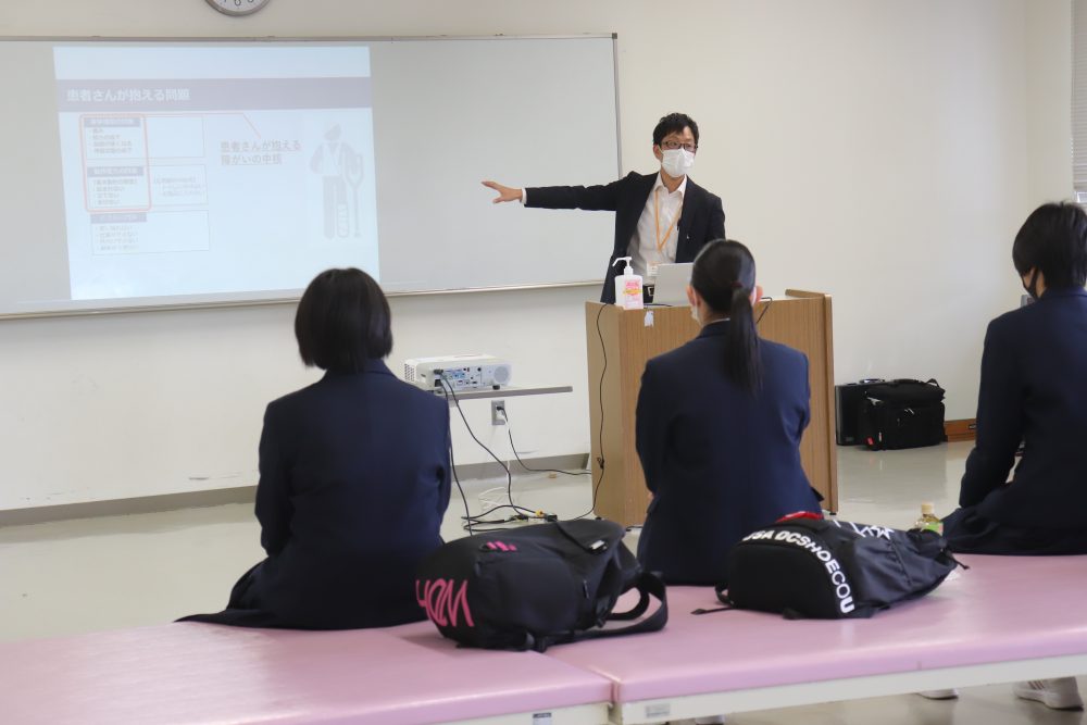 三刀屋高等学校の生徒達には理学療法士や作業療法士の職業についての説明を行ったあと、簡単なストレッチを行い身体の仕組みを学ぶ理学療法体験や、ブロックを並び替え脳の認知機能をテストする作業療法の体験の他、実際の授業見学を行いました。
