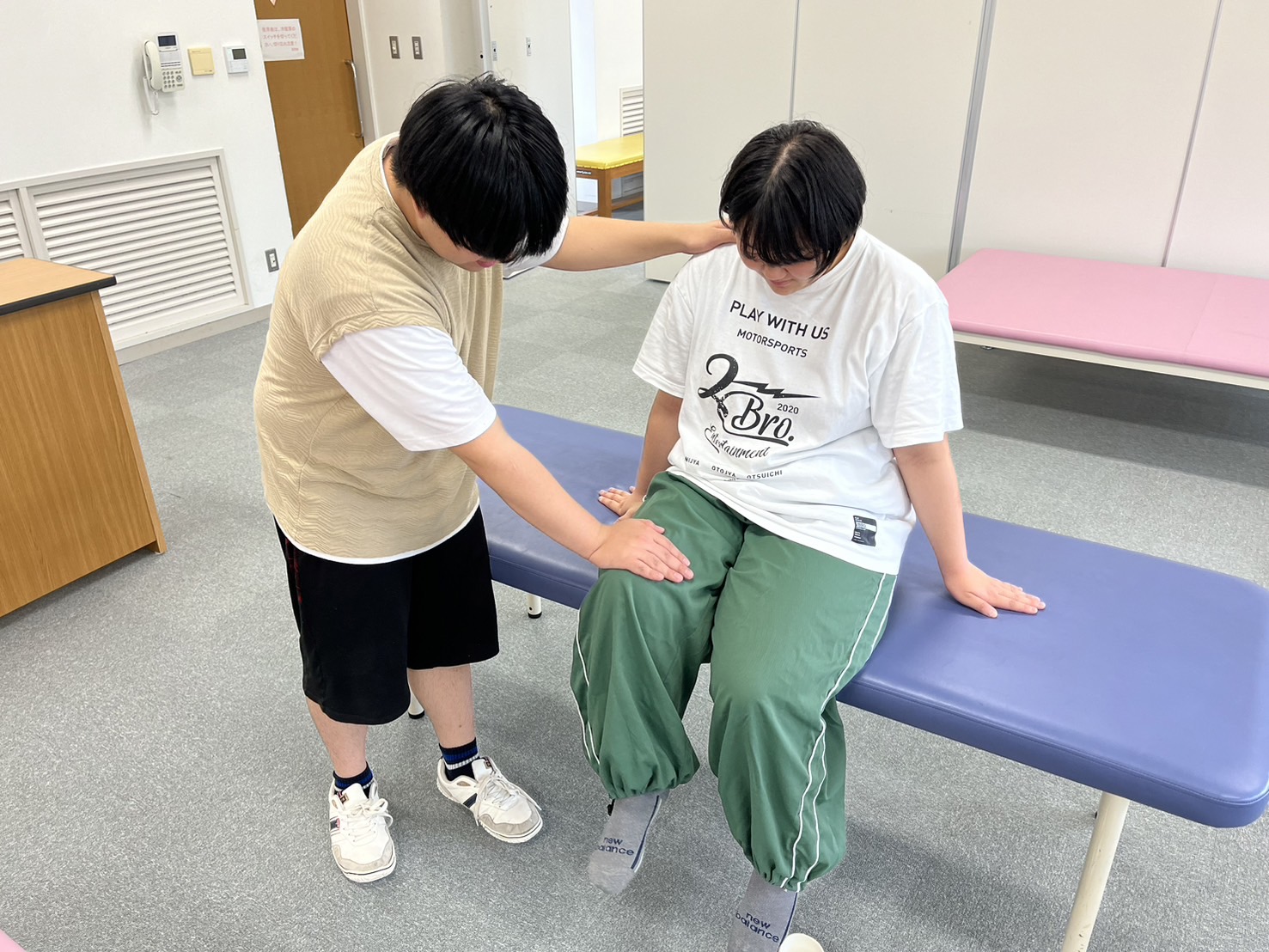 抵抗の力加減や姿勢の変化に苦労しながらクラスメイトで練習し合いました。