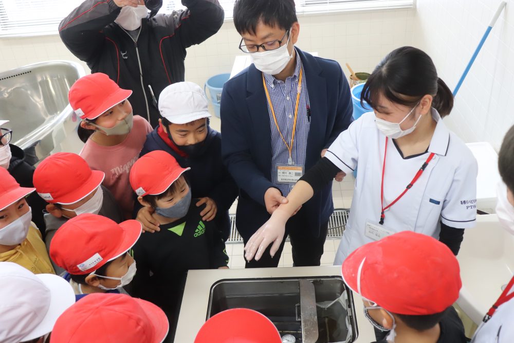 温熱療法では、50℃というパラフィン(ろう)の温度を聞いて、怖じ気づく子供たちでしたが、パラフィンは熱伝導が低いため、パラフィンにつけた手はポカポカになり、驚きの歓声があがりました。