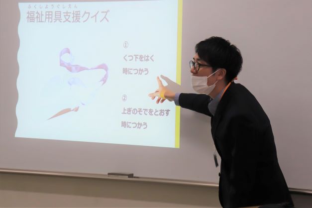 この日の体験では、脳の認知機能を測定するためのパズルや、身体の動きの補助をする福祉用具が、どんな場面で利用されるのか〇×クイズなどを行い、楽しみながら作業療法を学びました。