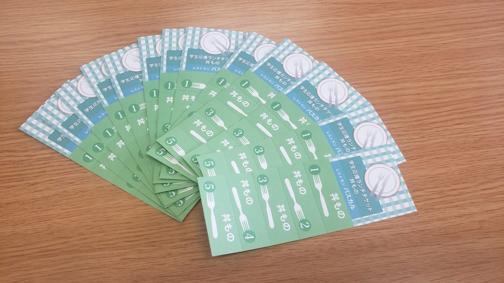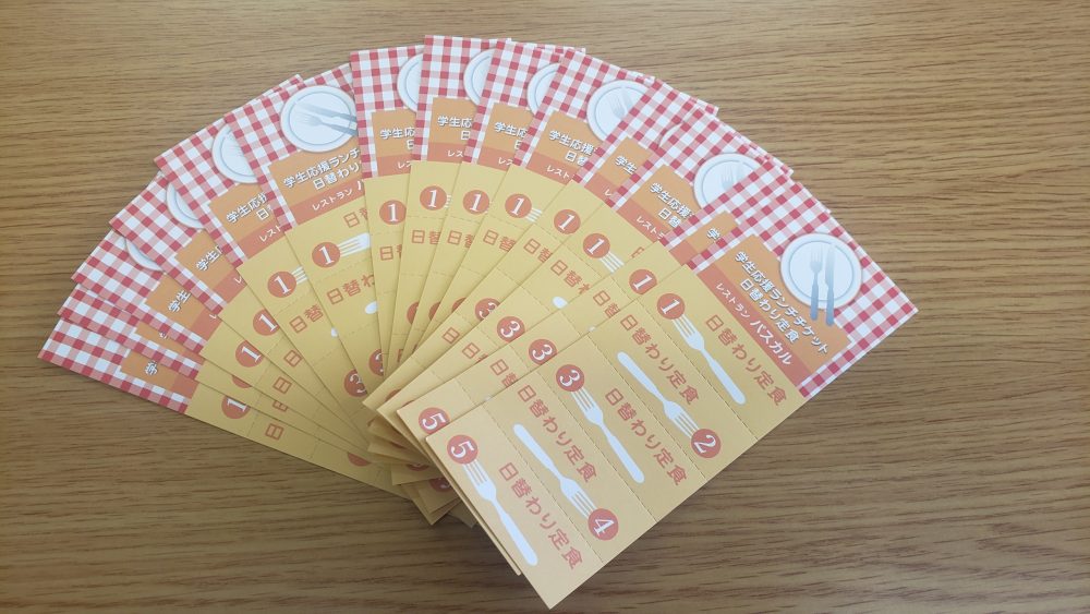 昨年に引き続きコロナ感染拡大によりアルバイト収入等が減少した学生の一助となるようにレストランパスカルで利用可能な『学生応援ランチチケット』の配布を行いました。
