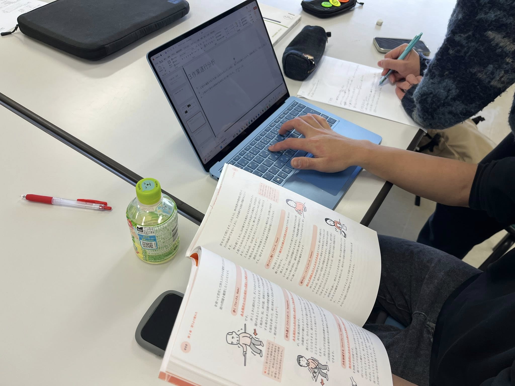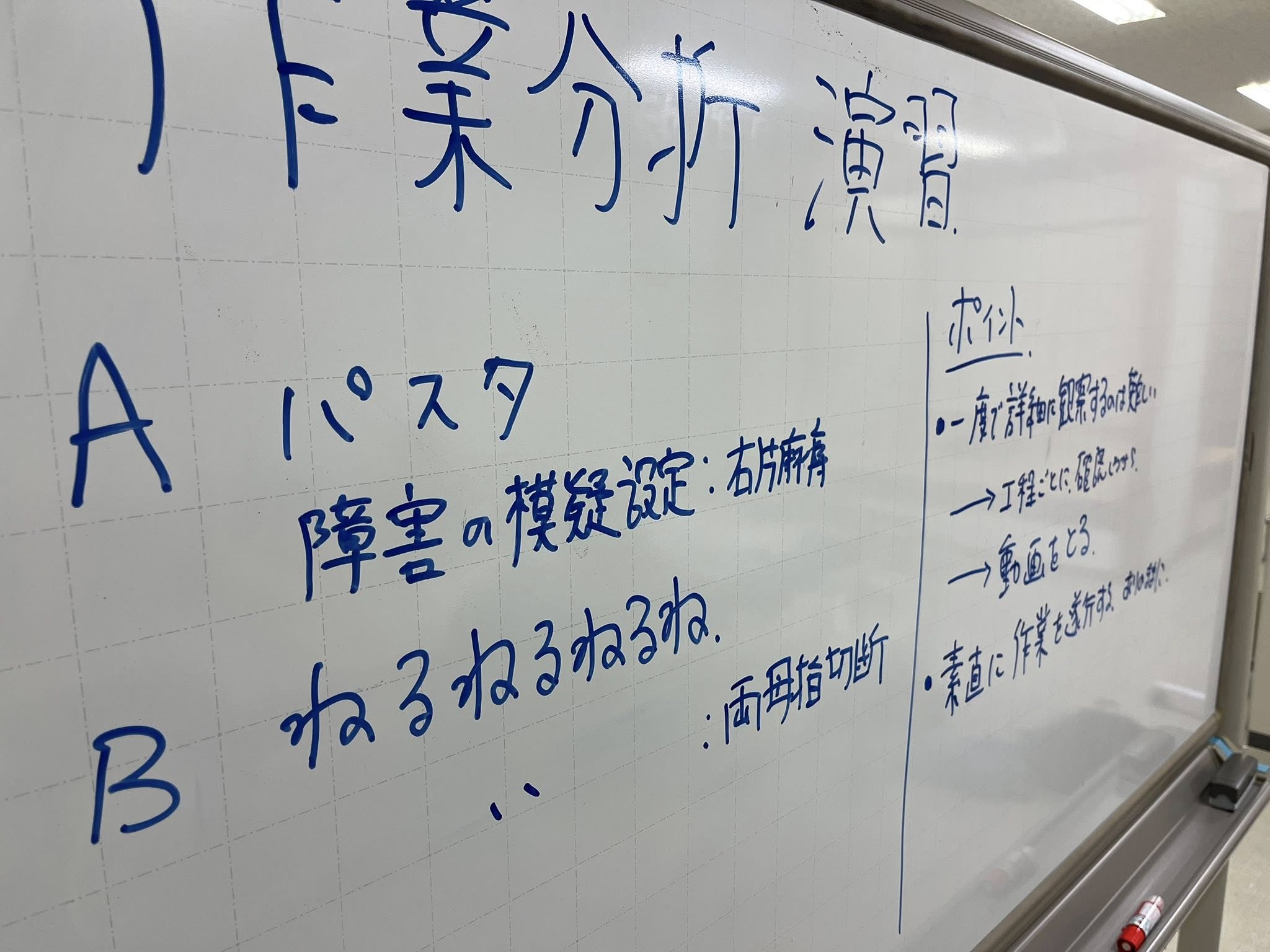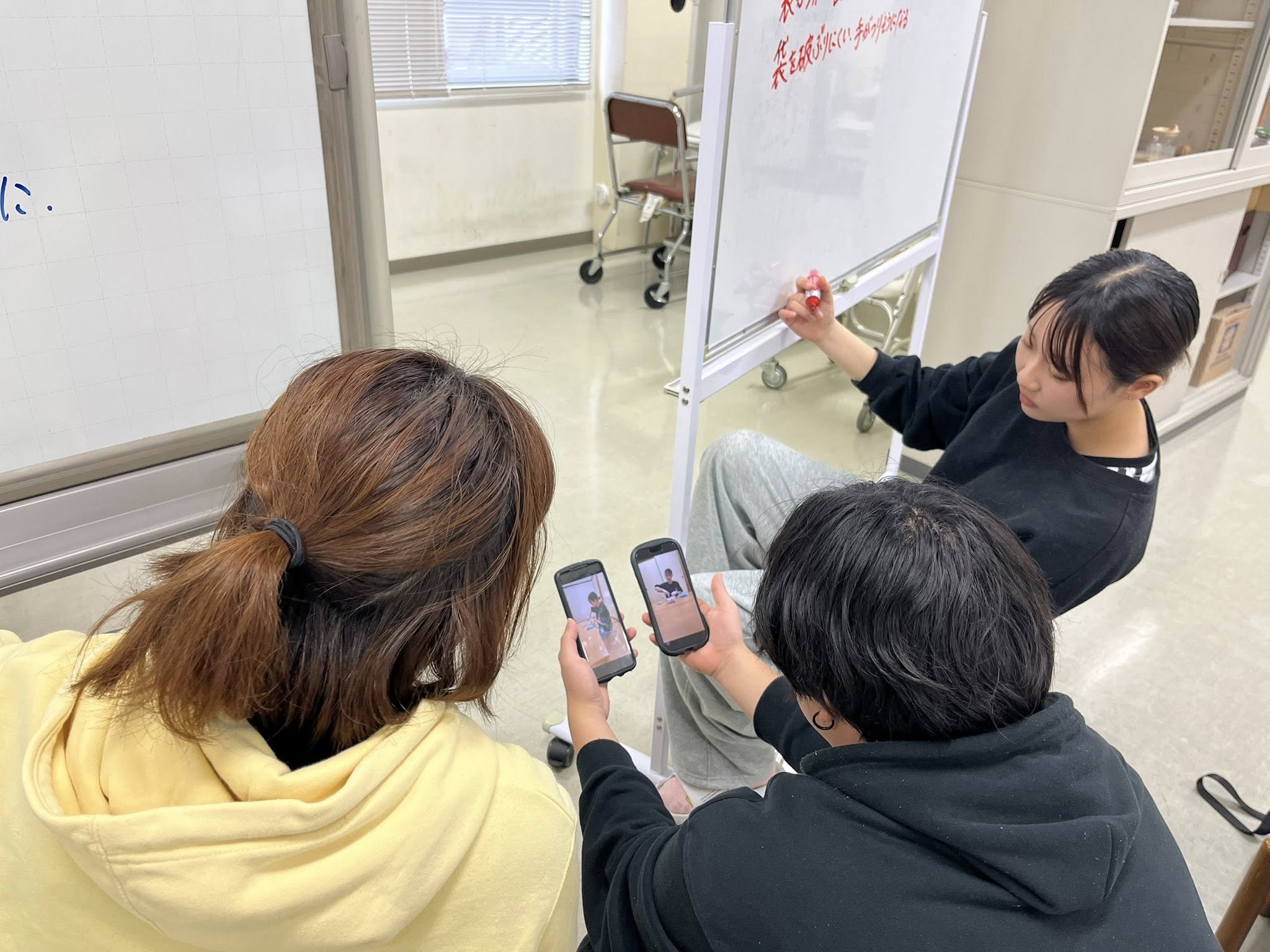実際の作業場面を観察し、分析しました。一度見ただけでは分からないこともあるため、動画で撮影し、繰り返し見返しながら遂行分析を行う様子が見られました。学生たちは動画と教科書を行き来し、試行錯誤しながら理解を深めていました。