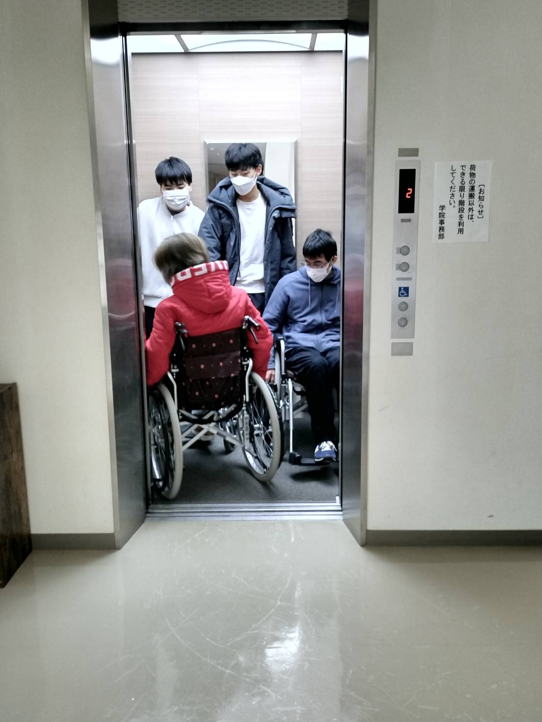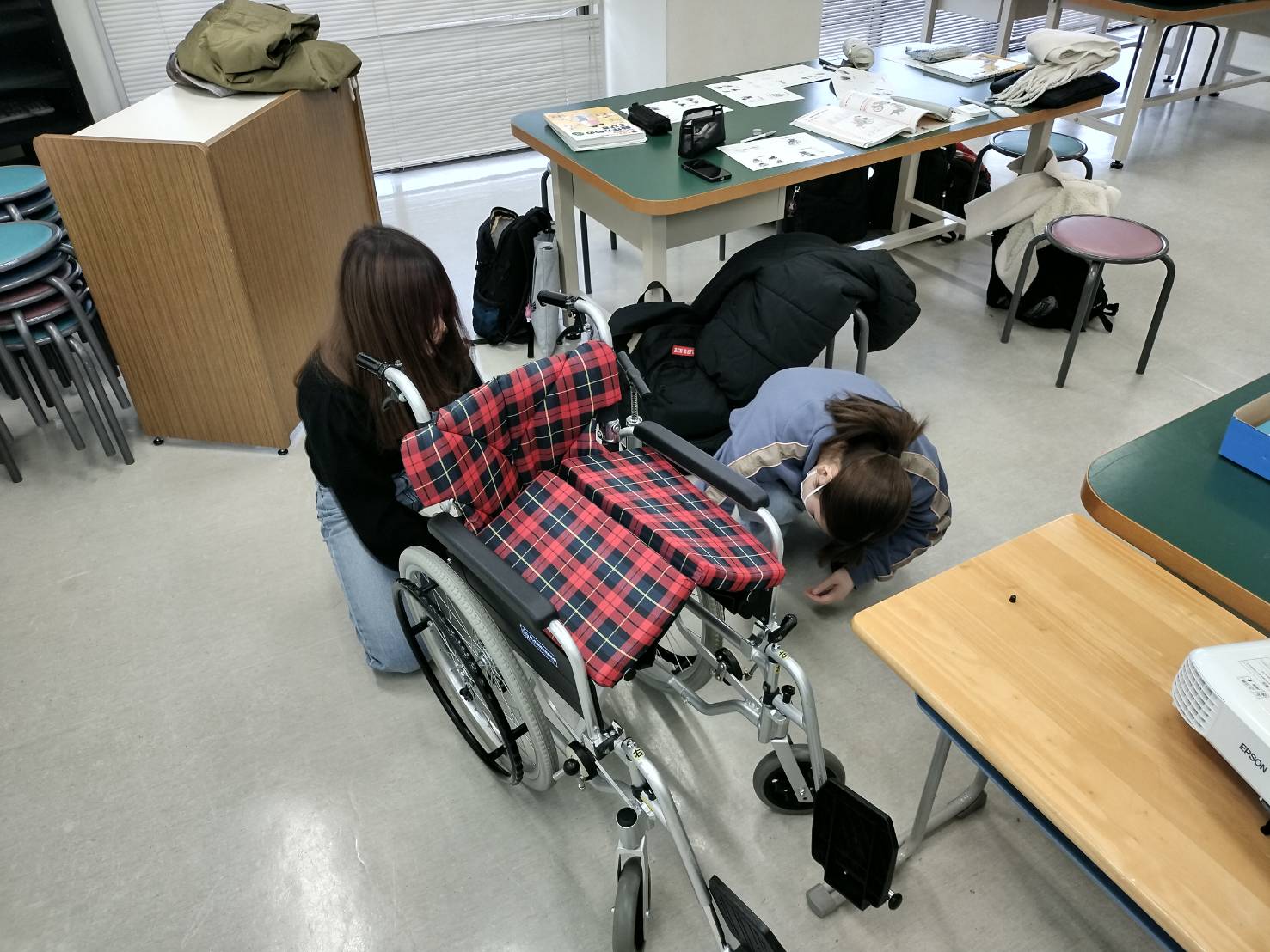 今回は「車椅子」について学びを深めました。教科書だけでなく、車椅子に安全に乗るための簡単なメンテナンスを行った後、校内を自分で漕いで移動したり、介助される体験をしてみました。何気なく歩いていると気にならないマットや、ドアの幅が車椅子で通過しようとすると車輪が引っかかったり、ぶつかったり、思わぬ障壁につながることを体験の中で実感しました。