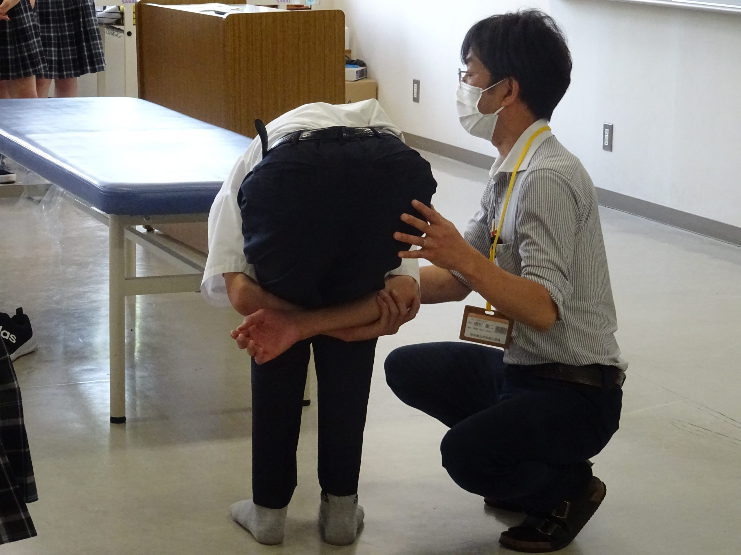 その後は、簡単なストレッチ体験や、バイオメカニクスの応用で身体の不思議を体験していただき、ふだん何気なく使っている身体がどのように動くのか、身体の仕組みについて少し触れていただきました。
