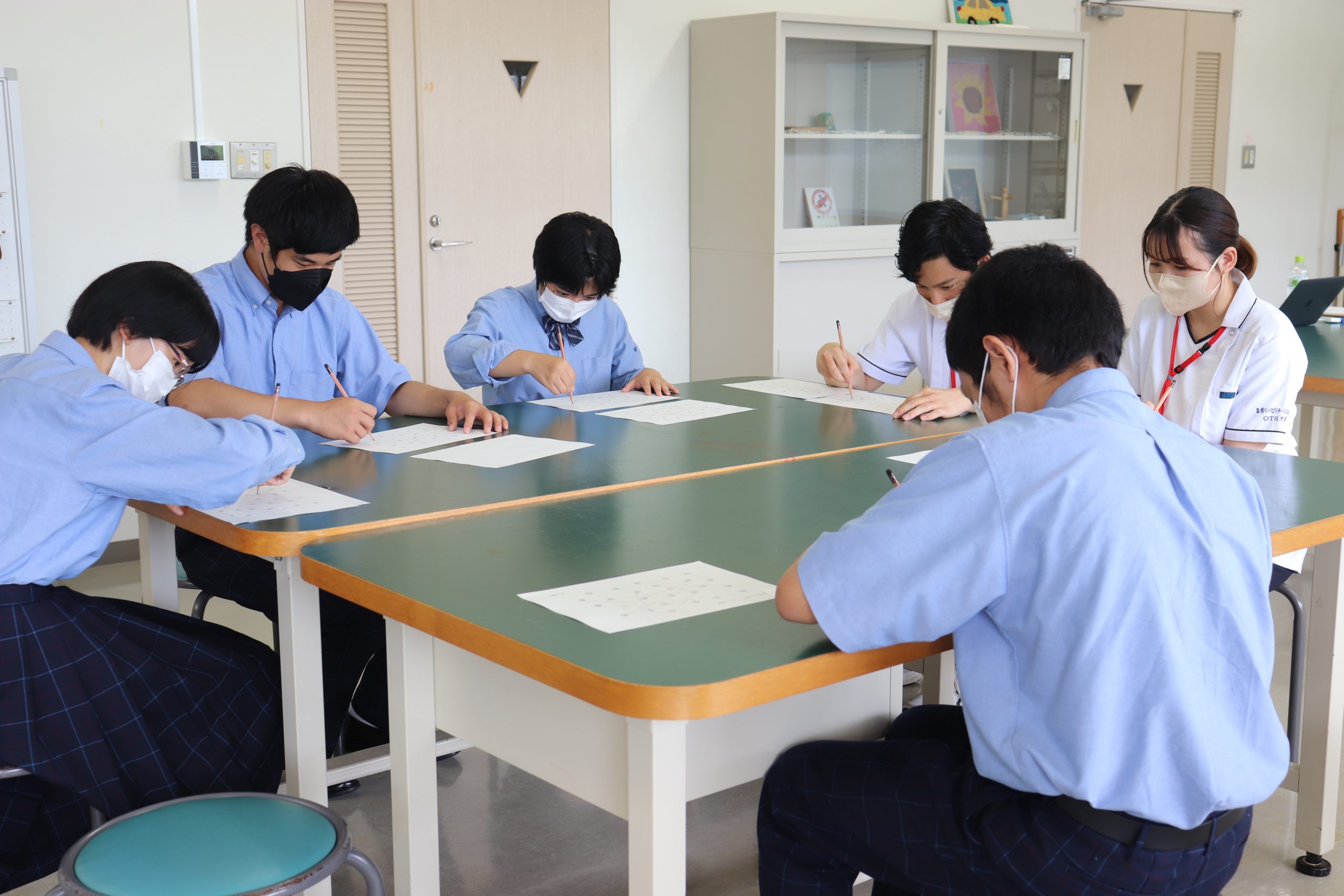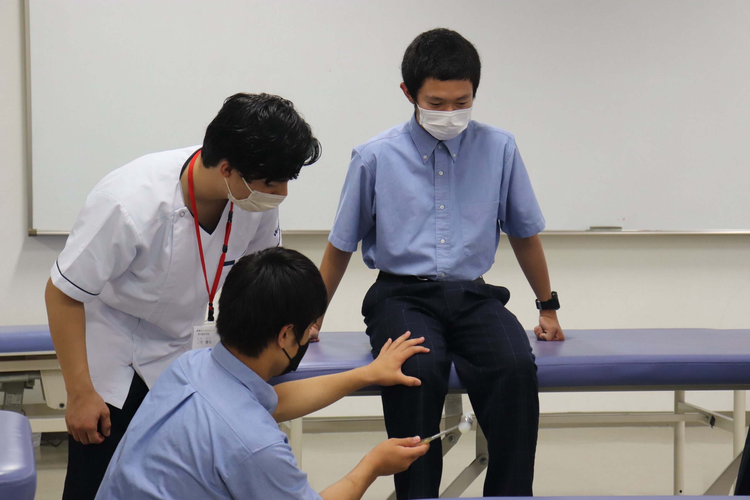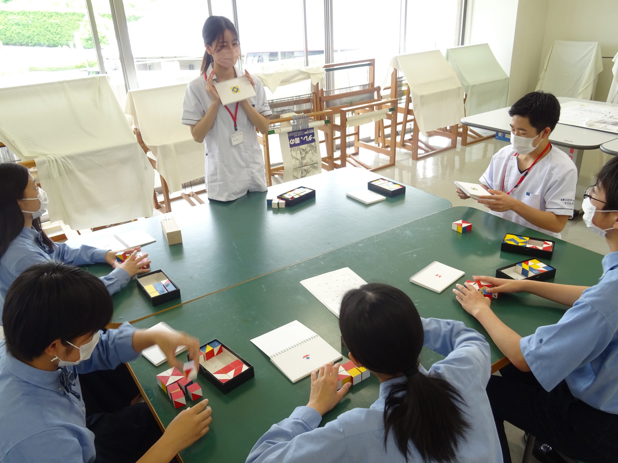 そしてグループに分かれ、理学療法学科・作業療法学科それぞれの在学生と一緒にいくつかの体験をブース形式で回り、体や頭を使って体験をしていただきました。理学療法では、パラフィンという治療器具を使った体験や腱反射の体験、作業療法では、コース立方体を用いた感覚的な体験や紙と鉛筆を使って自分の内面を探る心理的な体験など、初めての経験に驚きや関心の声が聞こえ、楽しい雰囲気で見学会を終えることができました。