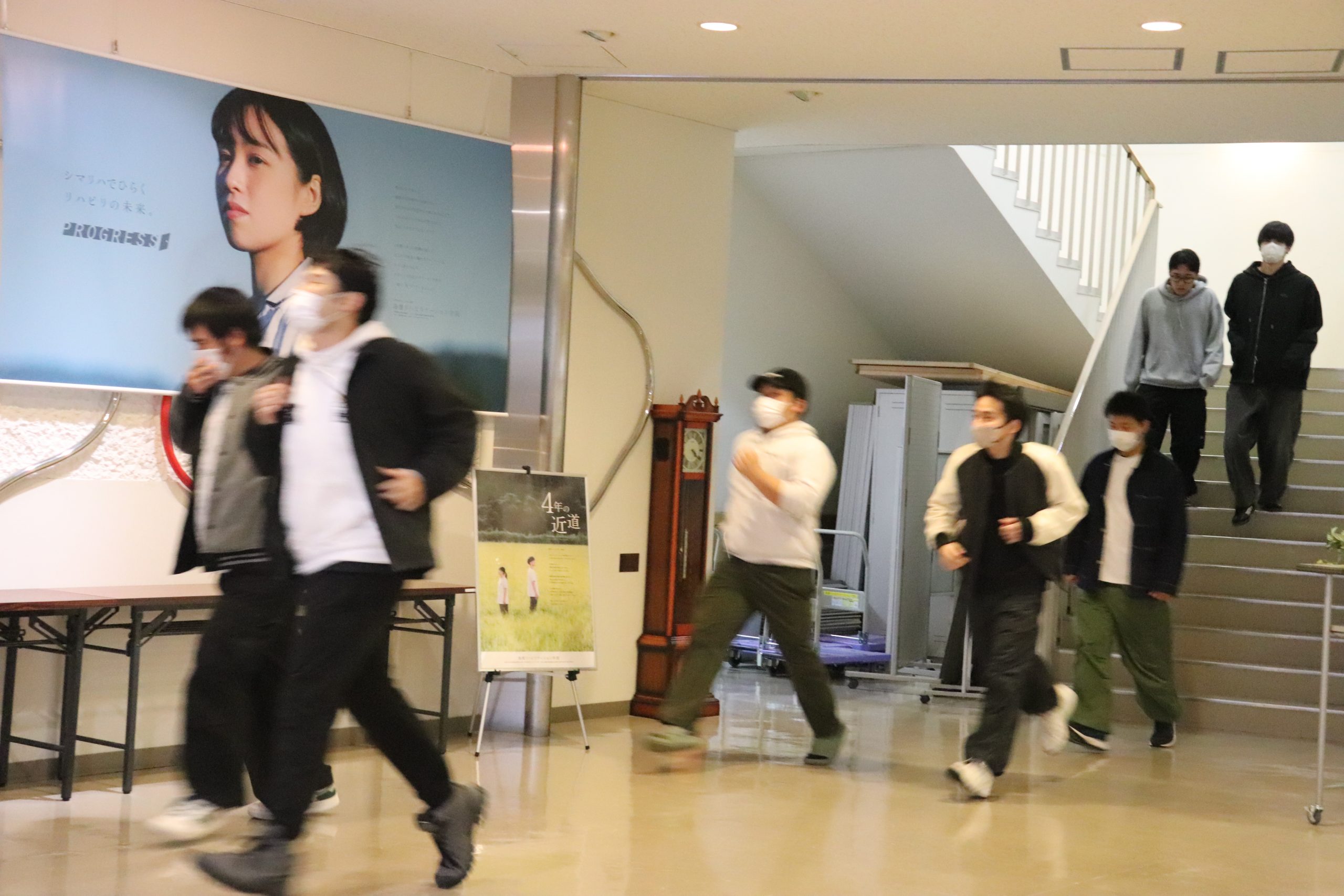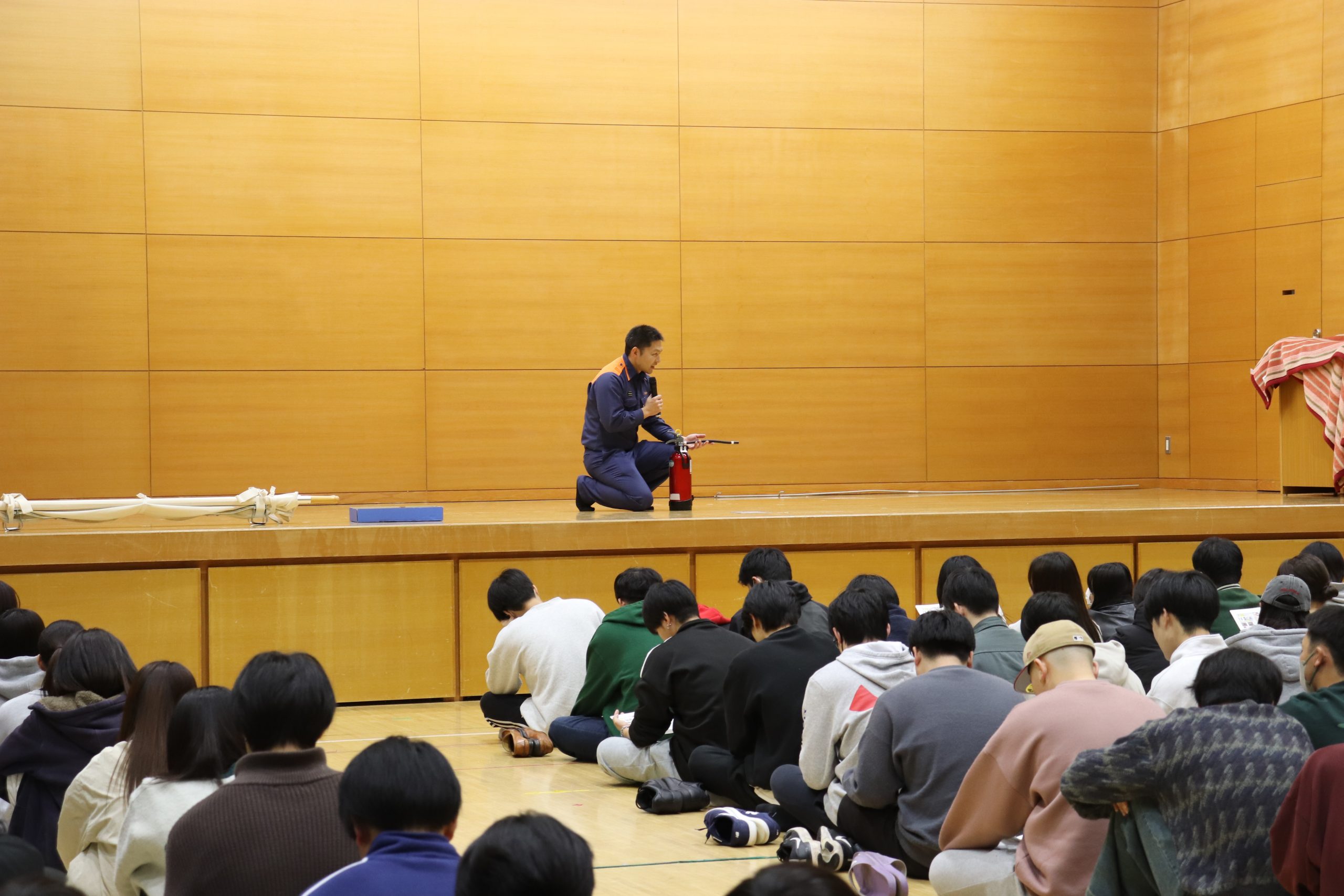 基礎作業実習室から出火したことを想定し、避難誘導班、消防班、確認班、総務班と役割分担し訓練に取り組みました。