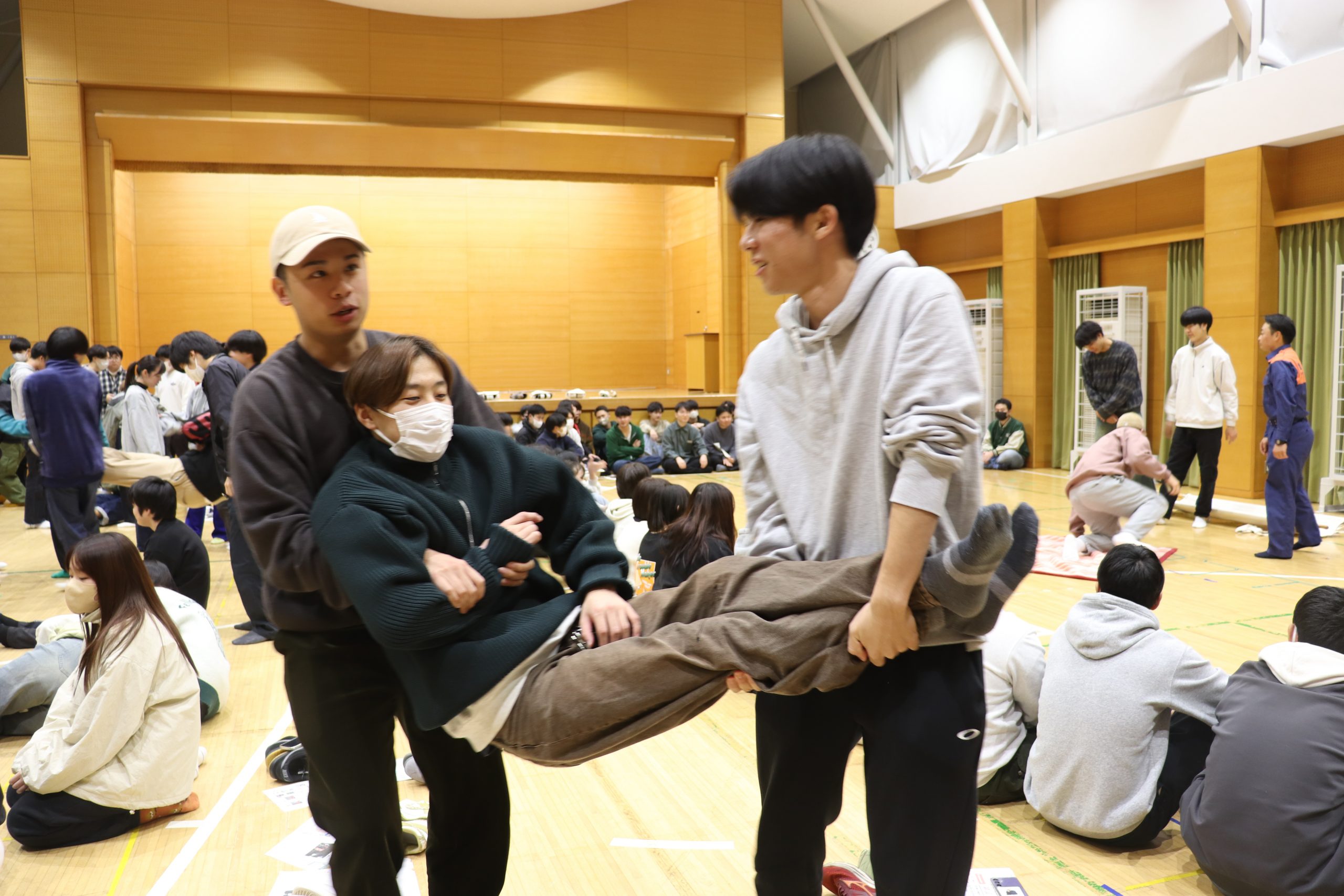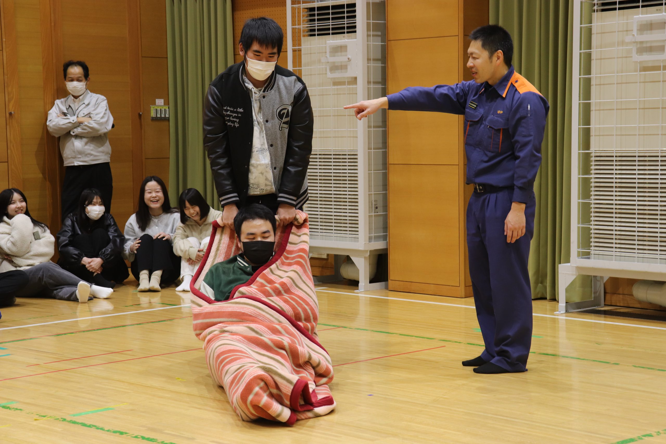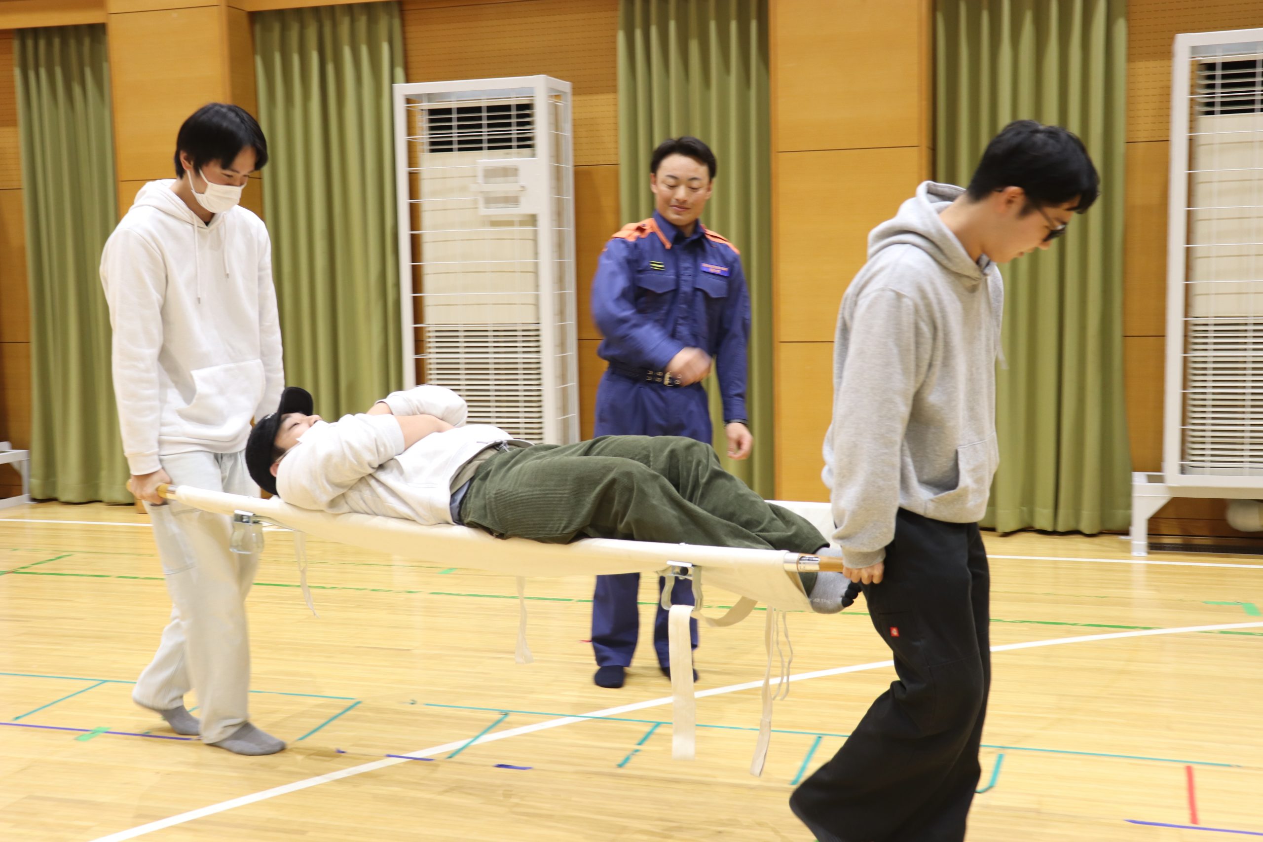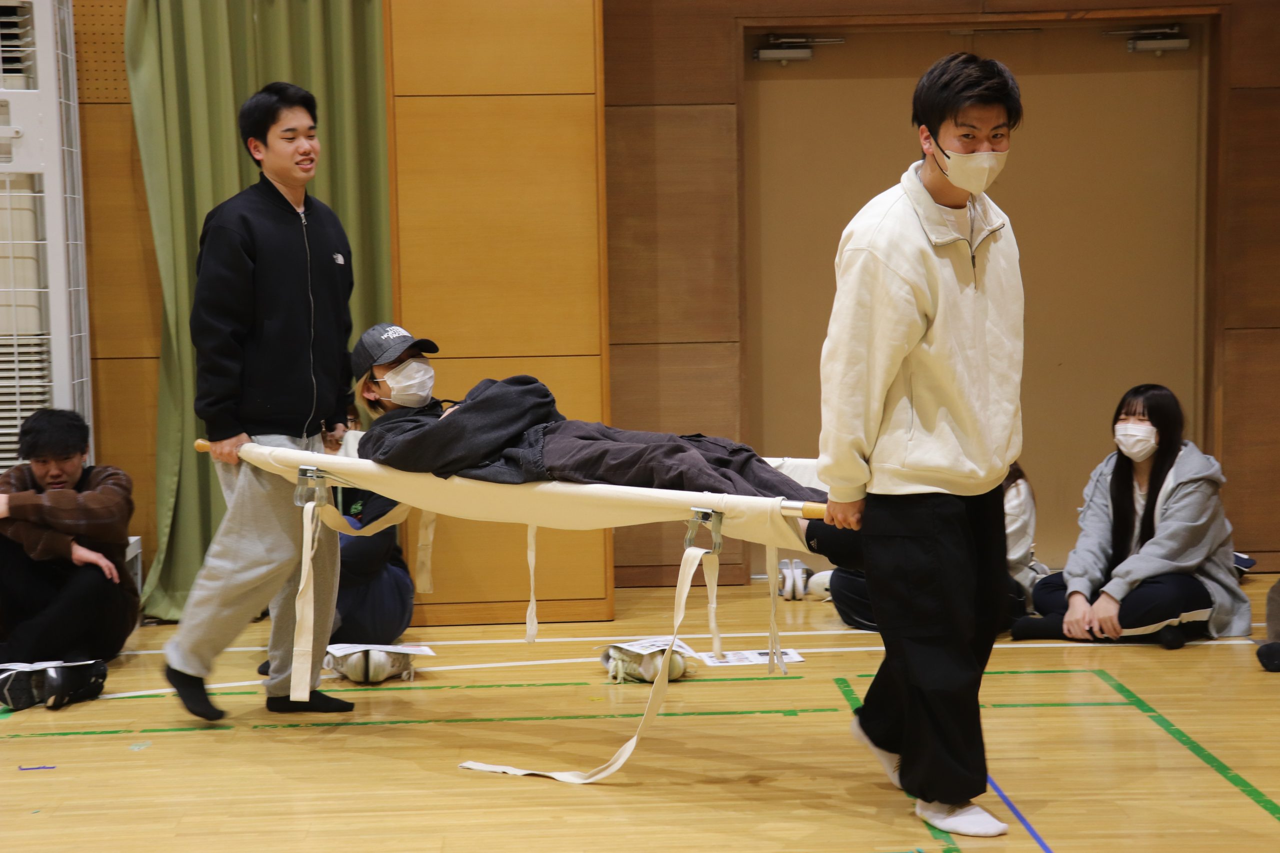 避難訓練後は消防署の方による消火器の使用方法、担架を使った搬送訓練、担架がない場合の搬送訓練を学年に分かれ行いました。