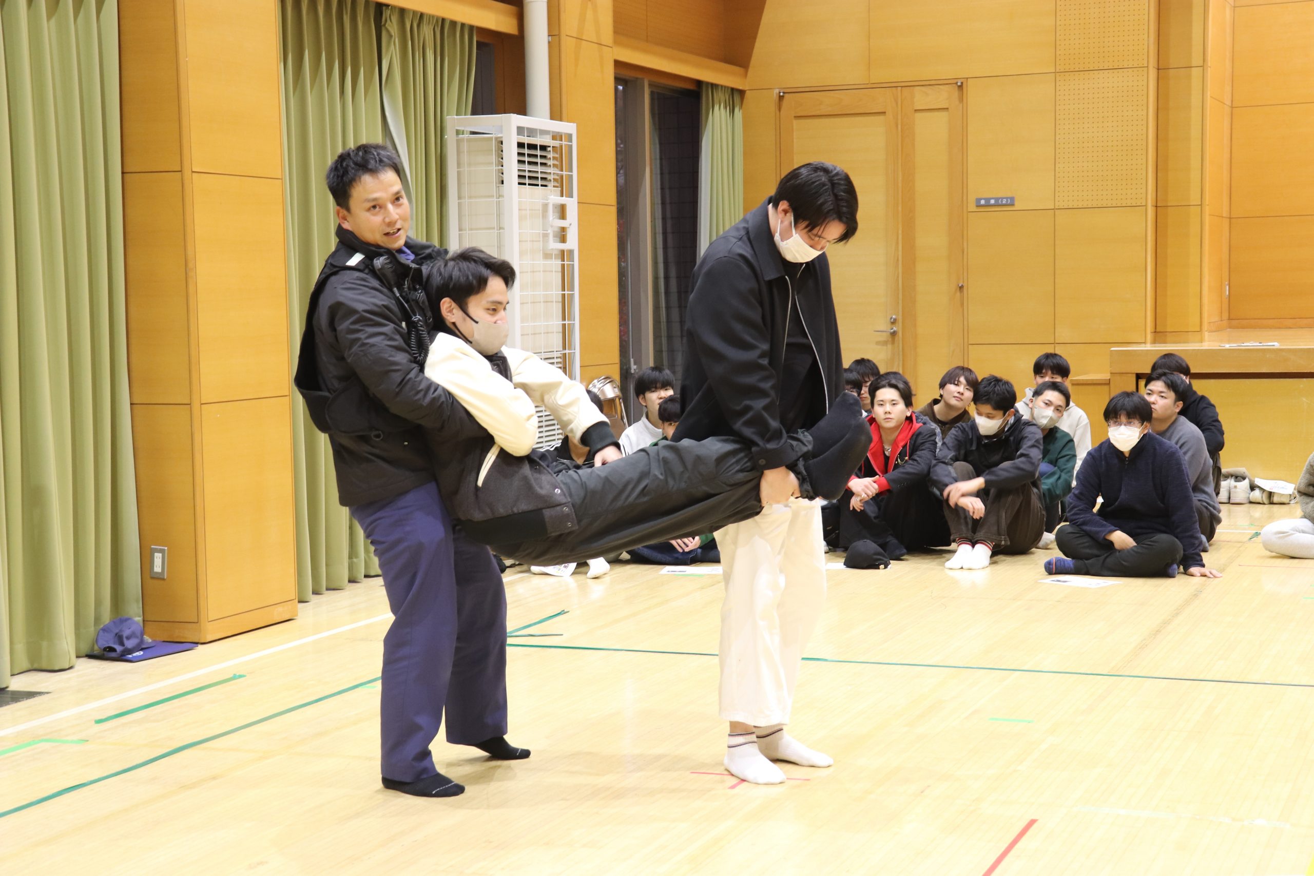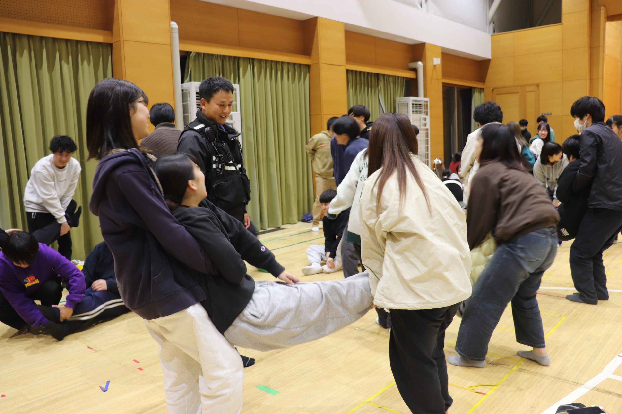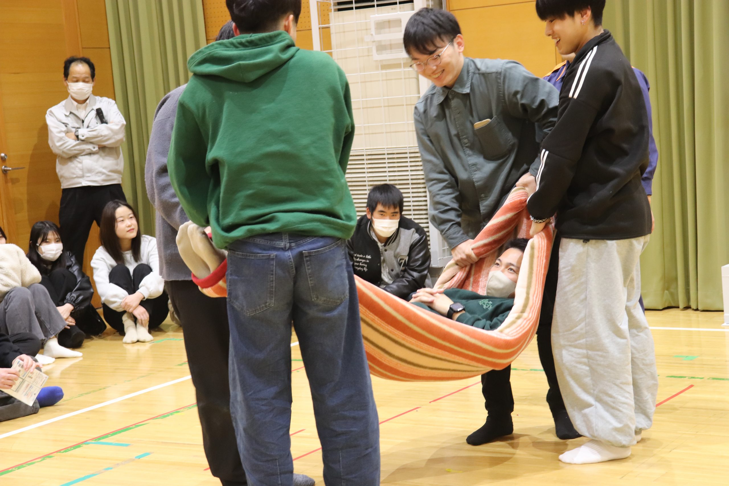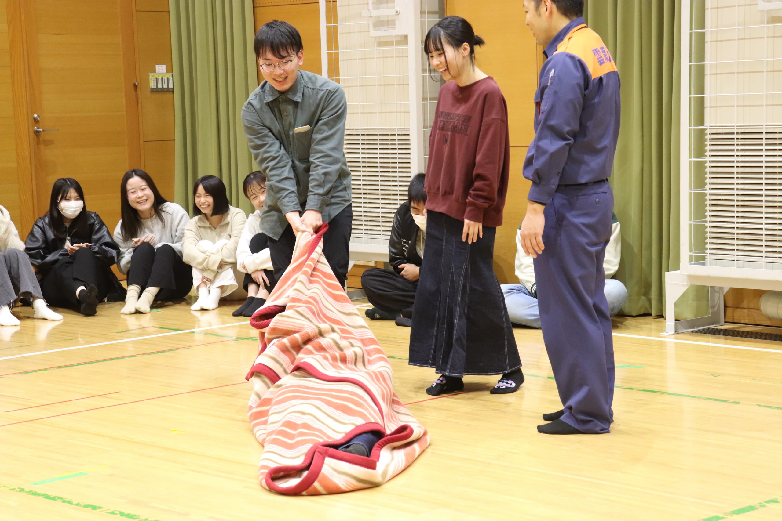 避難訓練後は消防署の方による消火器の使用方法、担架を使った搬送訓練、担架がない場合の搬送訓練を学年に分かれ行いました。