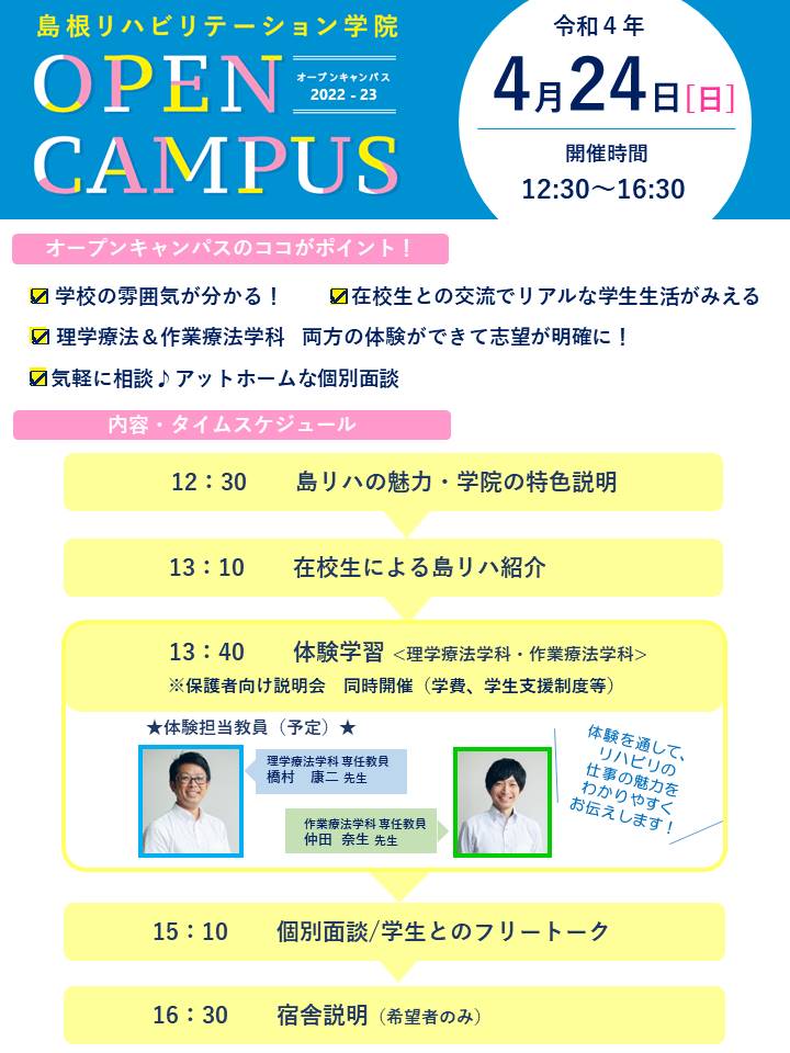 島リハの新学期最初のオープンキャンパスは、4月24日(日)に開催します。