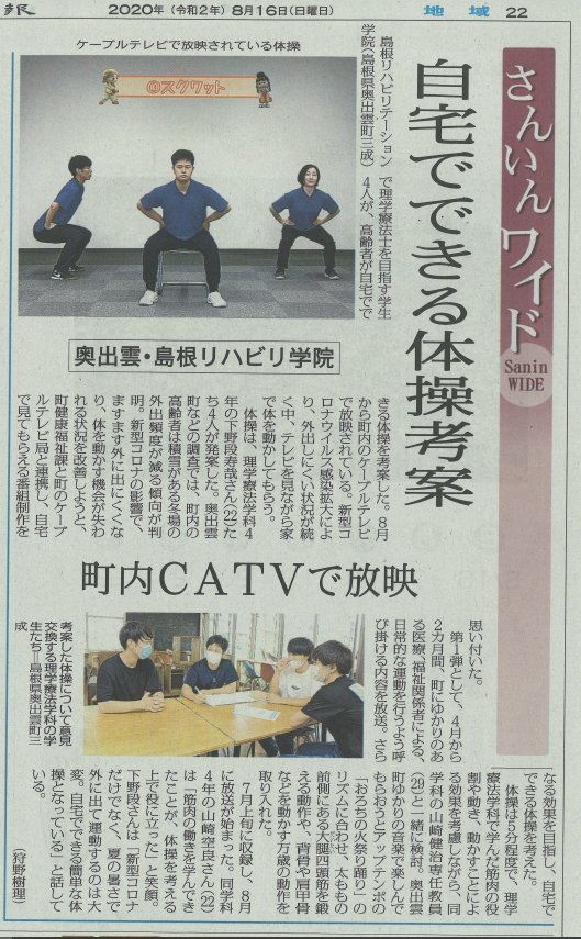 8/16付の山陰中央新報社に学生が考案した自宅でできる体操が掲載されました。