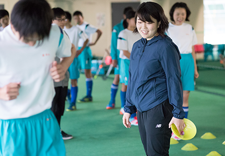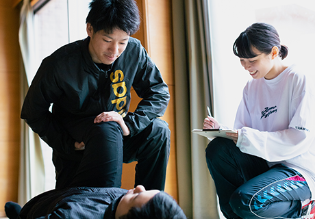 スポーツの舞台で、選手が最高の結果を出せるようサポートを行うスポーツトレーナー。トレーニング指導をはじめ、競技中や練習中のケガの予防と応急処置、試合に向けたコンディション調整など、理学療法の観点から選手とチームを支える縁の下の力持ち的存在です。