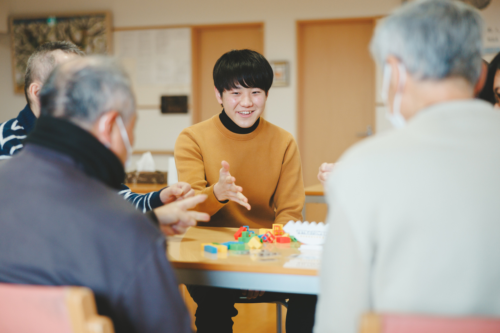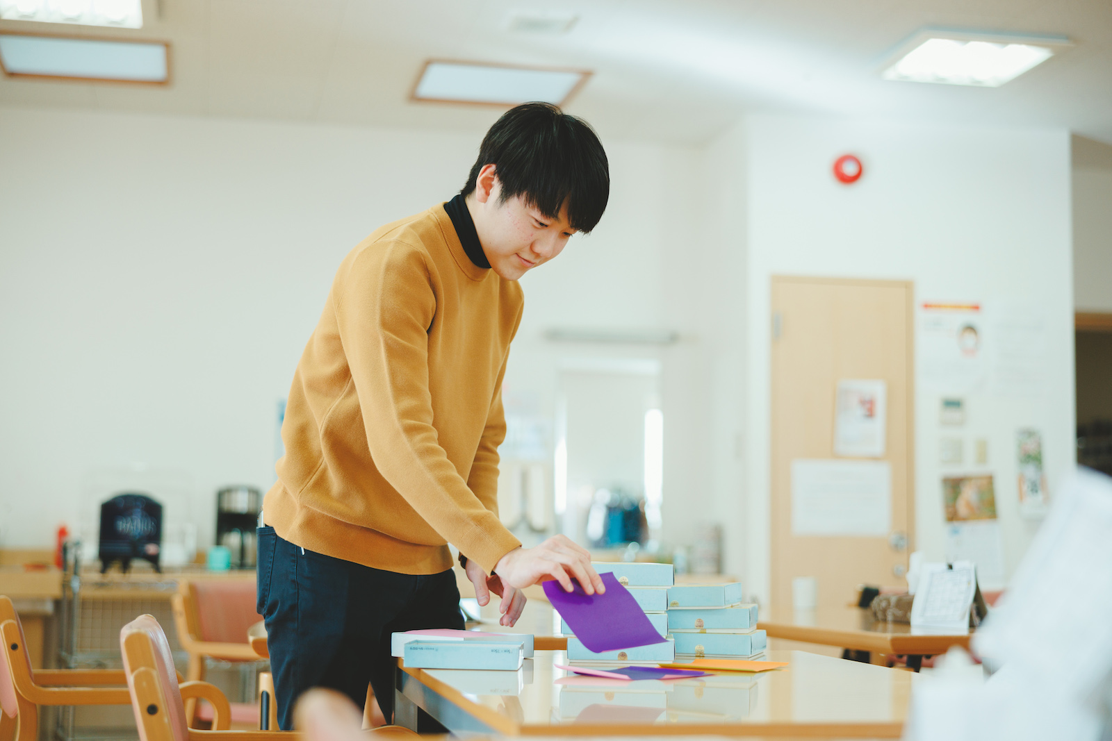 私がいるのは高次脳機能障害デイケアです。高次脳機能障害とは、脳梗塞や交通事故などで脳の機能の一部に障害が起きた状態です。障害により、記憶やしゃべることに困難を抱えた方、集中力を保ちにくくなった方、感情のコントロールが難しくなった方など、さまざまな利用者さんがデイケアに通っておられます。個々それぞれに利用の目的がありますが、基本的には利用者さんのやりたいことを中心に、何人かのグループでまとまって集団リハビリテーションを行います。私たちスタッフも混じり、一緒になってボードゲームやスポーツ、作品づくりなどをします。また、仕事に就きたい利用者さんへの就労支援も大事な役割です。同じ施設内には精神科デイケア、認知症デイケアもあります。