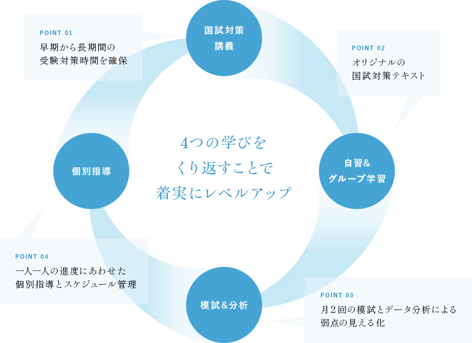学内模試と全国模試を2週に1回実施しデータ分析にかけることで、今の実力・弱点・課題を客観的に把握し、勉強するポイントが明確になります。同時に、問題を多く解くことで出題傾向も明らかにしていきます。