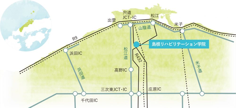 奥出雲町は、中国地方の中央に位置しており、島根県松江市・出雲市より車で約1時間、中国自動車道ICのある広島県三次市・庄原市や岡山県新見市および米子自動車道のある鳥取県米子市から約1時間余りのところにあります。 また、島リハ周辺には国道314号線・432号線が交差しており、JR木次線が通っています。学生たちは休日などに車で四季折々の自然を満喫しながら、実家に帰ったり、友達とドライブに出かけています。