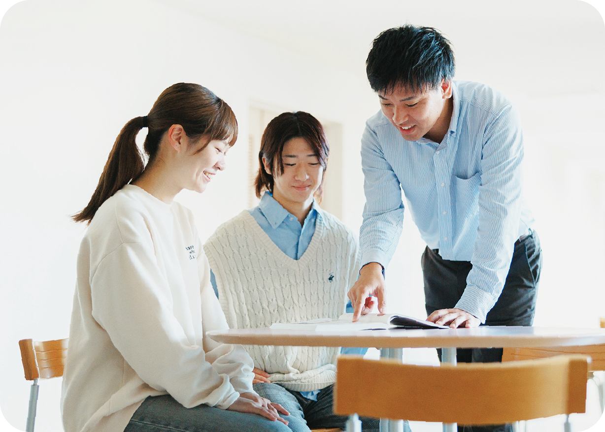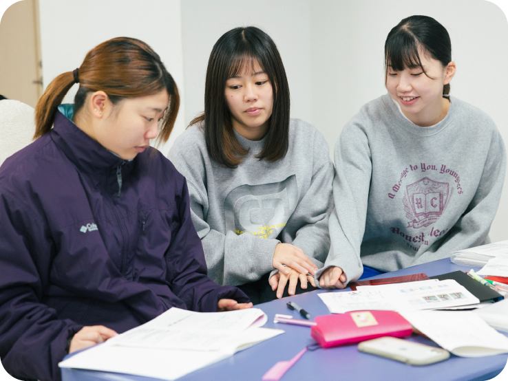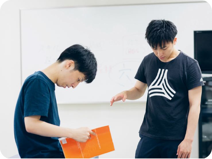 - 一人一人のレベルに合わせて、スケジュール設定・勉強の方法・目標の設定などを手厚く指導し、さらに分野ごとの専任教員が弱点の補講も実施しています。オープンな雰囲気の教務室は、いつでも学生が質問に来れるような環境を整えています。